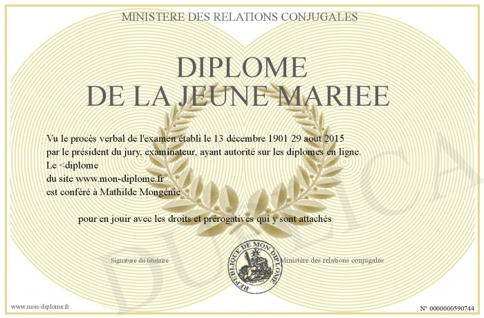 Envoyez par email votre Diplôme de la jeune mariée personalisé