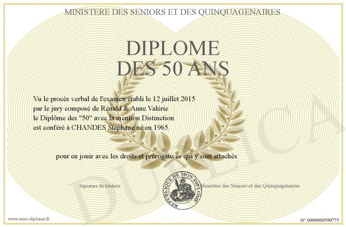 Envoyez par email votre Diplôme des 50 ans personalisé