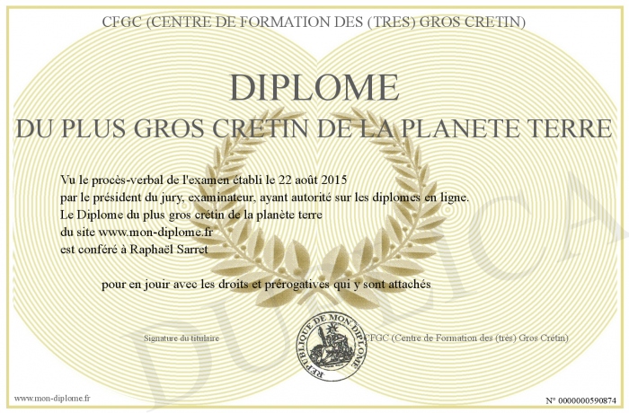 Envoyez par email votre Diplôme du plus gros crétin de la planète terre personalisé