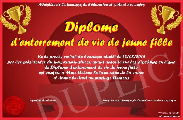 Envoyez par email votre Diplôme d'enterrement de vie de jeune fille personalisé