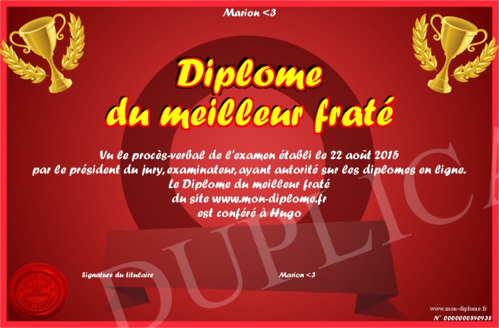 Envoyez par email votre Diplôme du meilleur fraté personalisé