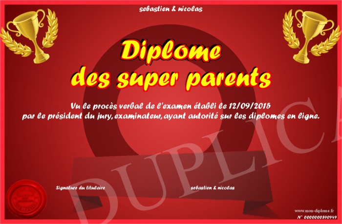 Envoyez par email votre Diplôme des super parents personalisé