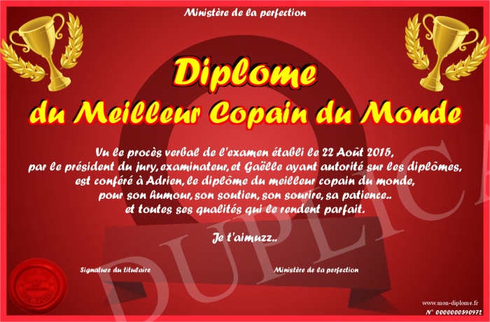 Envoyez par email votre Diplôme du Meilleur Copain du Monde personalisé