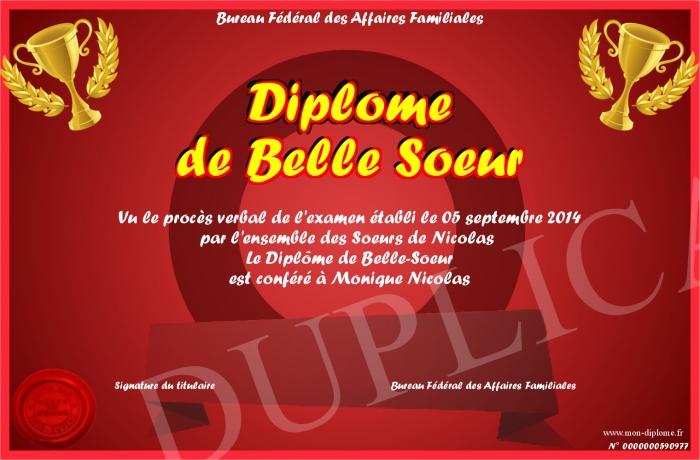Envoyez par email votre Diplôme de Belle Soeur personalisé