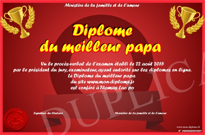 Envoyez par email votre Diplôme du meilleur papa personalisé