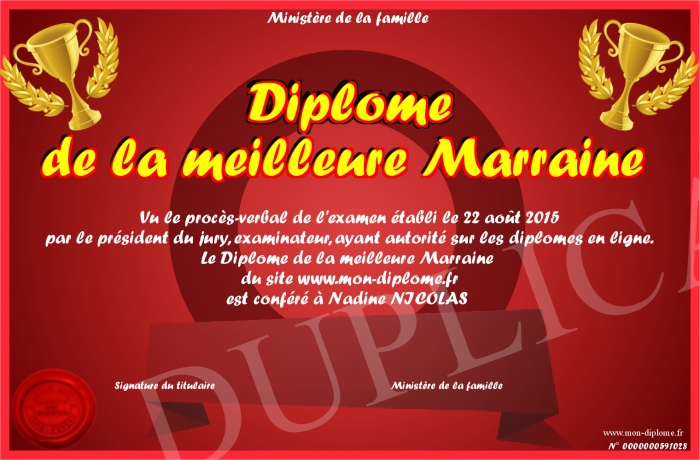 Envoyez par email votre Diplôme de la meilleure Marraine personalisé
