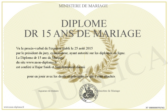 Envoyez par email votre Diplôme dr 15 ans de Mariage personalisé