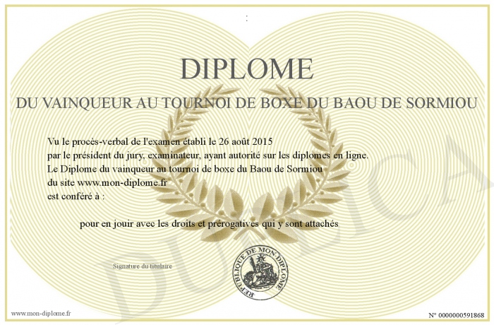 Envoyez par email votre Diplôme du vainqueur au tournoi de boxe du Baou de Sormiou personalisé