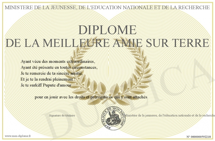 Envoyez par email votre Diplôme de la meilleure amie sur terre personalisé