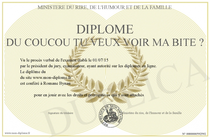 Envoyez par email votre Diplome du coucou tu veux voir ma bite ? personalisé