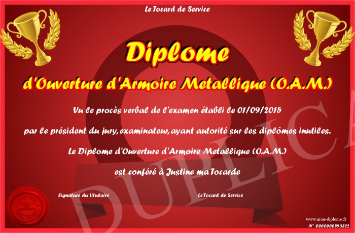 Envoyez par email votre Diplôme d'Ouverture d'Armoire Metallique (O.A.M.) personalisé