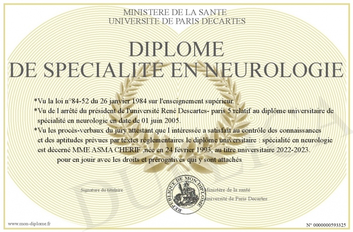 Envoyez par email votre Diplôme de spécialité en neurologie personalisé