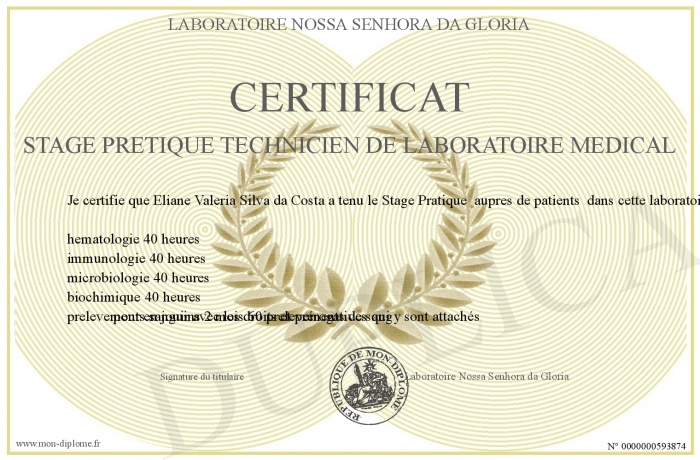 Envoyez par email votre Certificat Stage Pretique Technicien de Laboratoire Médical personalisé