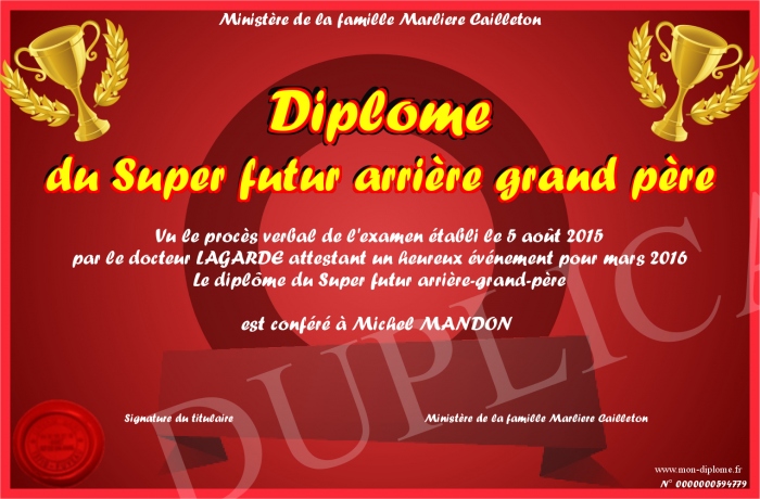 Envoyez par email votre Diplôme du Super futur arrière grand père personalisé