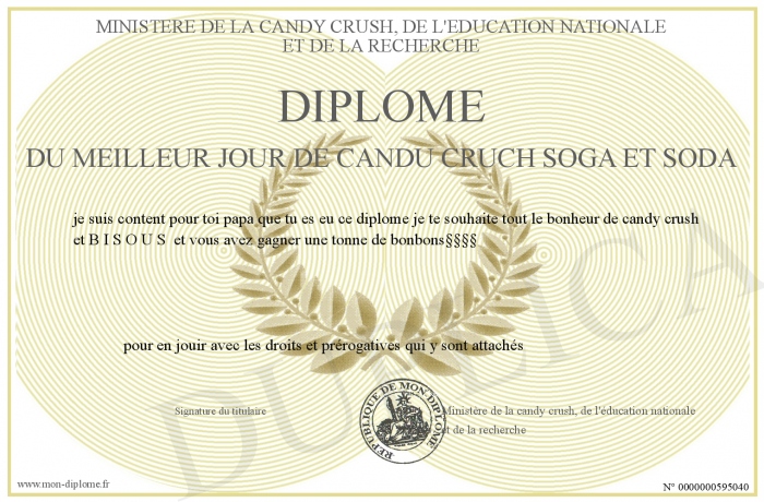 Envoyez par email votre Diplôme du meilleur jour de candu cruch soga et soda personalisé