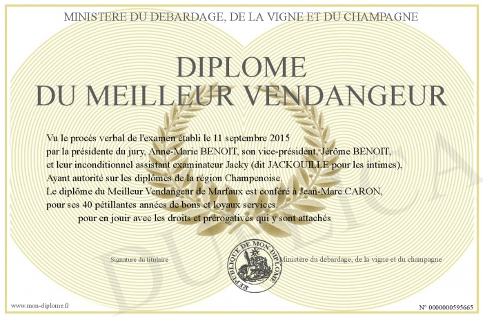 Envoyez par email votre Diplôme du meilleur vendangeur personalisé