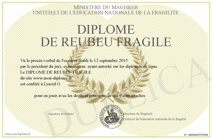Envoyez par email votre DIPLOME DE REUBEU FRAGILE personalisé