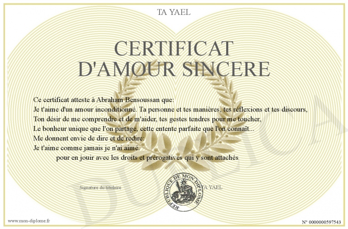 Envoyez par email votre Certificat d'amour sincère personalisé