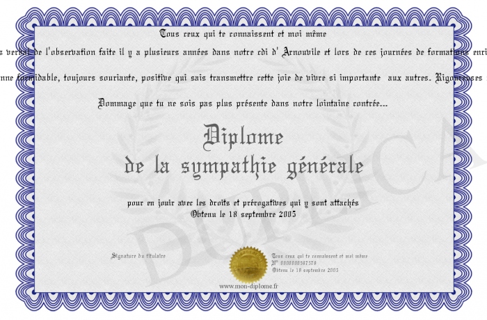 Envoyez par email votre Diplôme de la sympathie générale personalisé