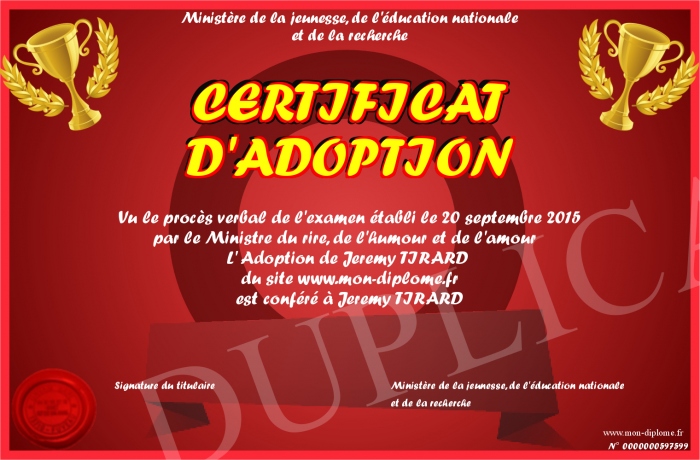 Envoyez par email votre CERTIFICAT D'ADOPTION personalisé