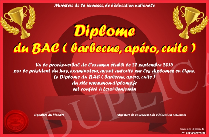 Envoyez par email votre Diplôme du BAC ( barbecue, apéro, cuite ) personalisé