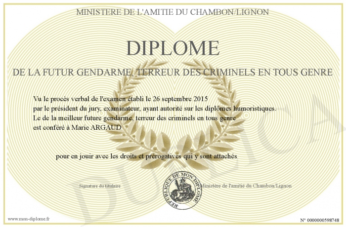 Envoyez par email votre Diplôme de la futur gendarme, terreur des criminels en tous genre personalisé