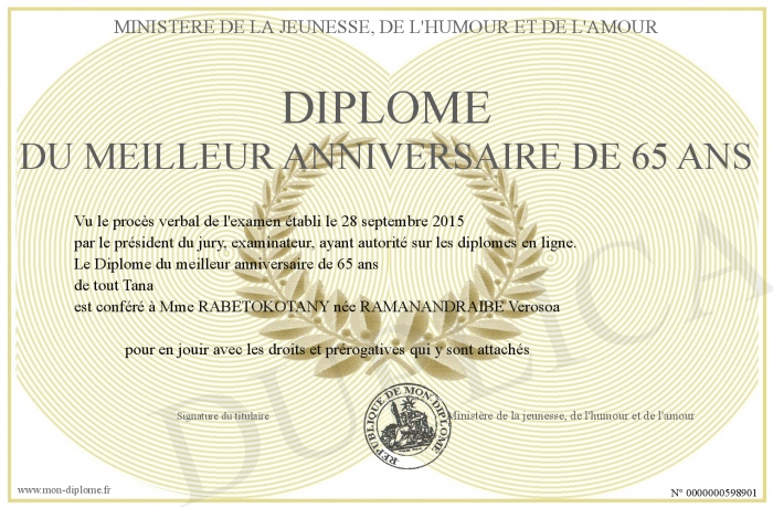 Envoyez par email votre Diplôme du meilleur anniversaire de 65 ans personalisé