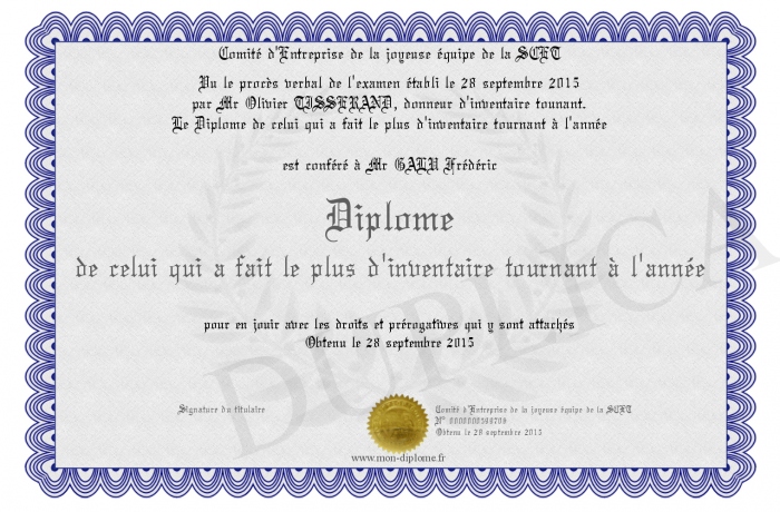 Envoyez par email votre Diplôme de celui qui a fait le plus d'inventaire tournant à l'année personalisé