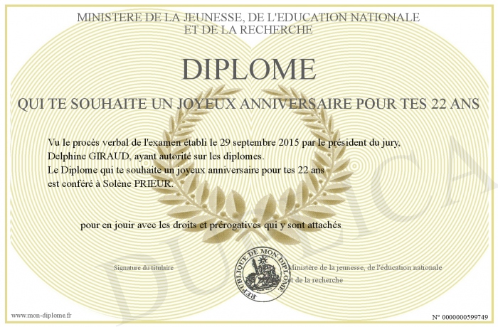 Envoyez par email votre Diplome qui te souhaite un joyeux anniversaire pour tes 22 ans personalisé