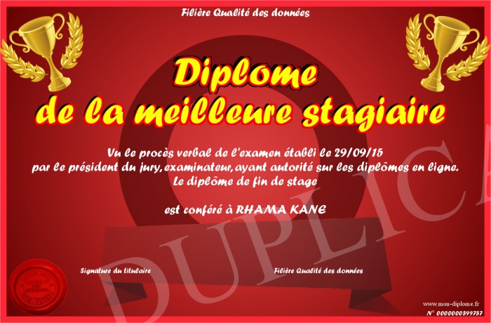 Envoyez par email votre Diplome de la meilleure stagiaire personalisé