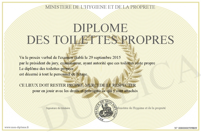 Envoyez par email votre Diplôme DES TOILETTES PROPRES personalisé