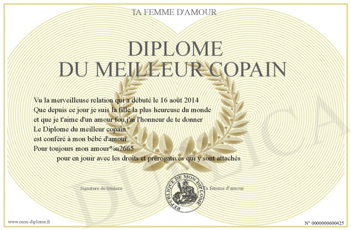 Envoyez par email votre Diplôme du meilleur copain personalisé