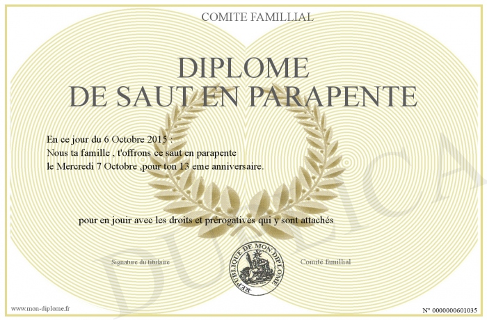 Envoyez par email votre Diplome de saut en parapente personalisé