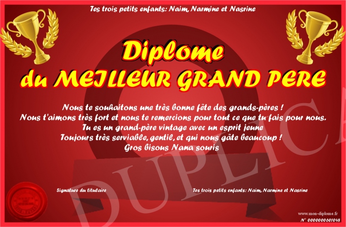 Envoyez par email votre Diplôme du MEILLEUR GRAND PERE personalisé