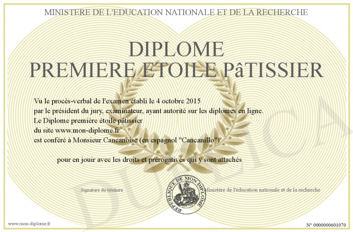Envoyez par email votre Diplôme première étoile pâtissier personalisé