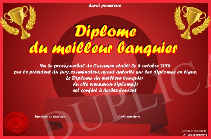 Envoyez par email votre Diplôme du meilleur banquier personalisé