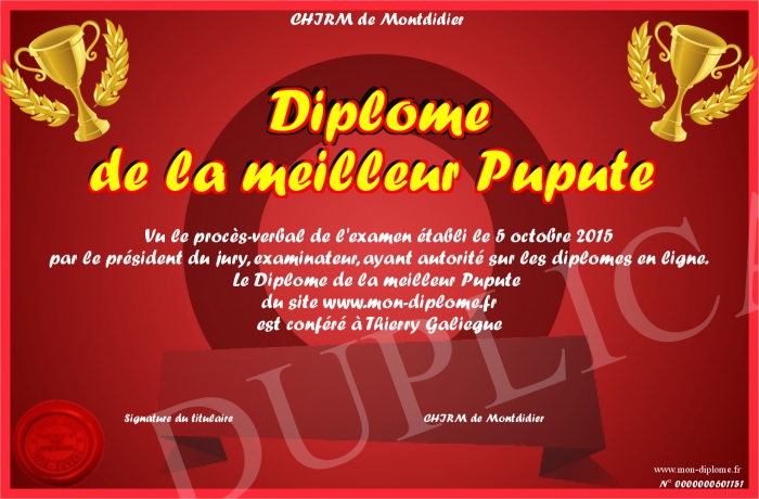 Envoyez par email votre Diplôme de la meilleur Pupute personalisé
