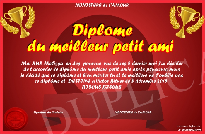 Envoyez par email votre Diplome du meilleur petit ami personalisé