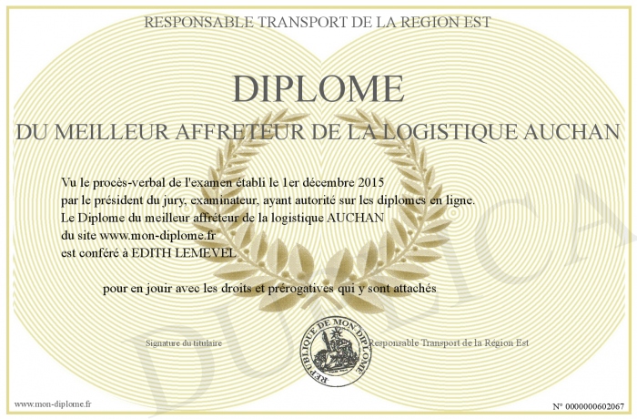 Envoyez par email votre Diplôme du meilleur affréteur de la logistique AUCHAN personalisé