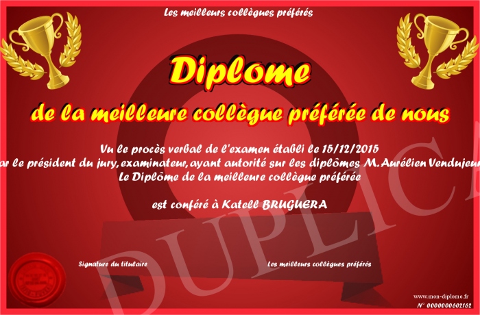 Envoyez par email votre Diplôme de la meilleure collègue préférée de nous personalisé
