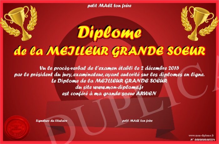 Envoyez par email votre Diplôme de la MEILLEUR GRANDE SOEUR personalisé