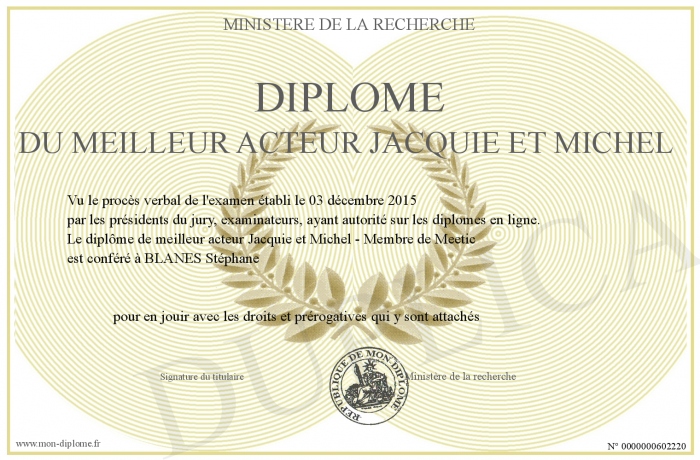 Envoyez par email votre Diplôme du meilleur acteur Jacquie et Michel personalisé