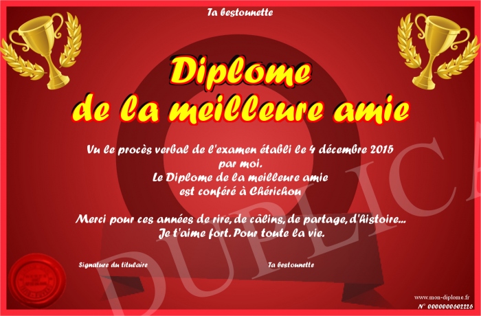 Envoyez par email votre Diplome de la meilleure amie personalisé