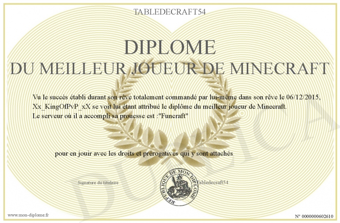 Envoyez par email votre Diplôme du meilleur joueur de Minecraft personalisé