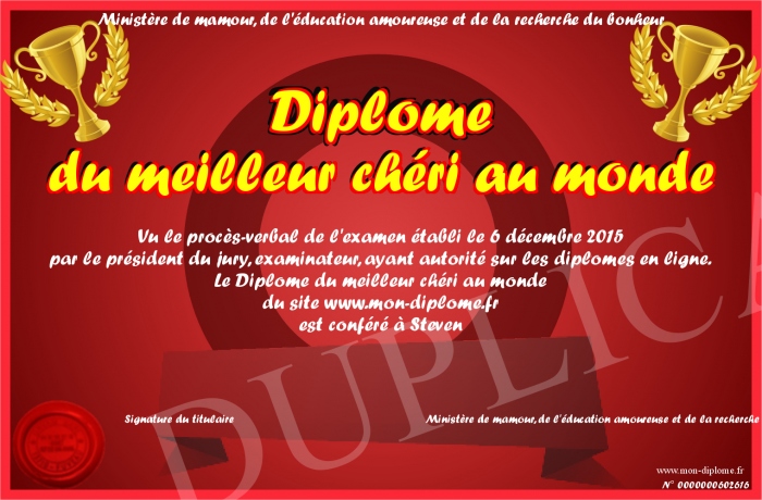 Envoyez par email votre Diplôme du meilleur chéri au monde personalisé