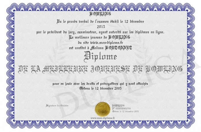 Envoyez par email votre Diplôme DE LA MEILLEURE JOUEUESE DE BOWLING personalisé