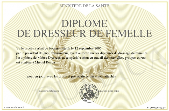 Envoyez par email votre Diplôme de dresseur de femelle personalisé
