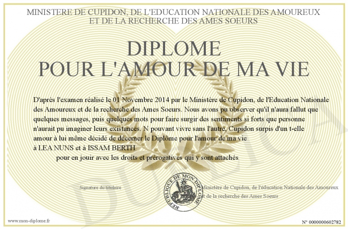 Envoyez par email votre Diplôme pour l'amour de ma vie personalisé