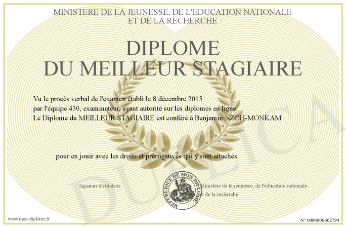 Envoyez par email votre Diplôme du MEILLEUR STAGIAIRE personalisé