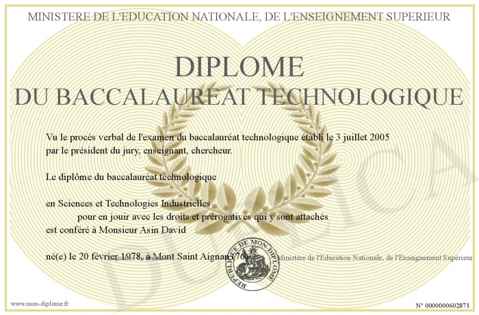Envoyez par email votre Diplôme du baccalaureat technologique personalisé